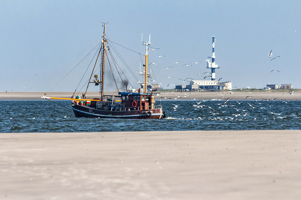 Der Kutter »HAR7« (»Poseidon«) passiert gerade das Ostende der Insel Wangerooge. Im Hintergrund sehen Sie die Nachbarinsel Minsener Oog, die durch die Blaue Balje von Wangerooge getrennt ist.