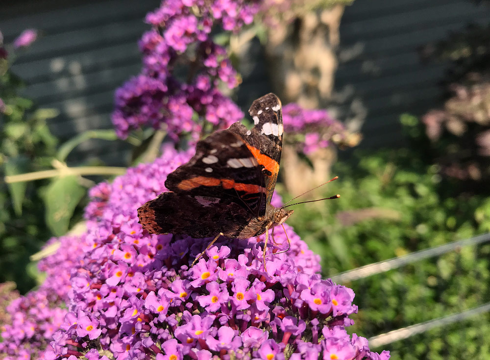 Dieser Admiral labt sich an der reichhaltigen Blütenpracht des Schmetterlingsflieders.