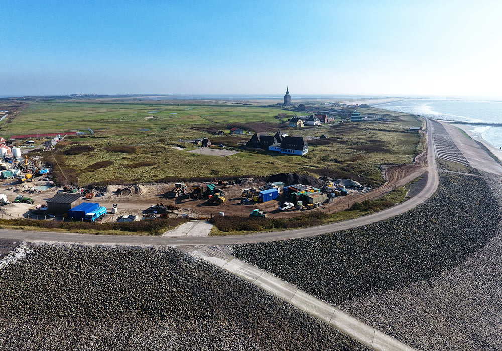 Ein Blick auf den westlichen Teil der Insel mit WSA-Bauhof und Westdorf, im Hintergrund ragt außerdem der Westturm empor.