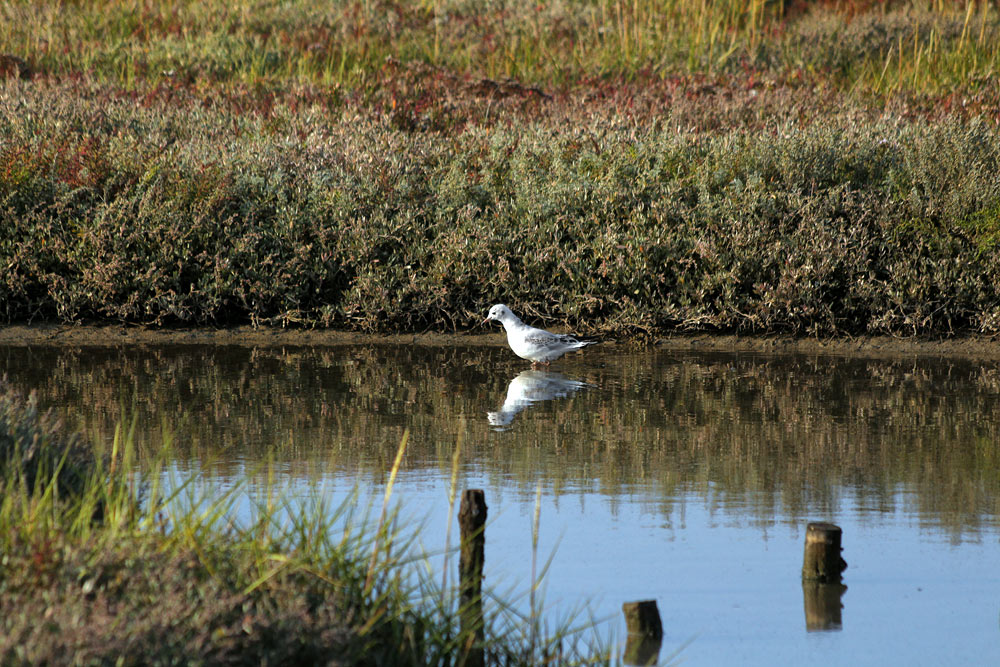 Am Rande eines Priels im Westaußengroden läuft eine junge Lachmöwe durchs Wasser.