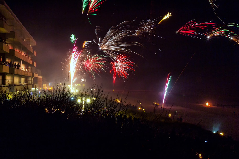 Auf der Strandpromenade und am Hauptstrand feiern die Menschen den Jahreswechsel mit Böllern, Raketen, Wunderkerzen, Sekt und Bier.