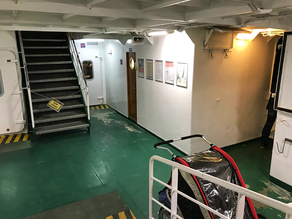 Kalt ist es, die Passagiere der MS Wangerooge halten sich während der Fährüberfahrt nach Harlesiel, bis auf den Bildautoren sowie eine Person rechts, lieber im Warmen auf.