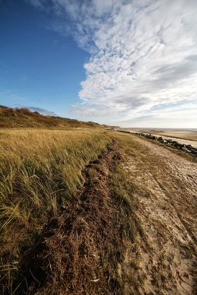 ‹ Zwischen Steindamm und der Dünenkette führt ein Dünenweg direkt in Richtung Ostende. In der Bildmitte erkennt man außerdem Treibgut aus Pflanzenresten (sogenannte Flutmarke), das dort während einer Sturmflut abgeladen wurde.
