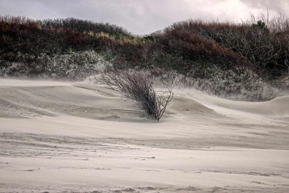 Beachtliche Sandwehen haben sich im Lee-Bereich der Sandfangzäune aus Buschwerk gebildet.