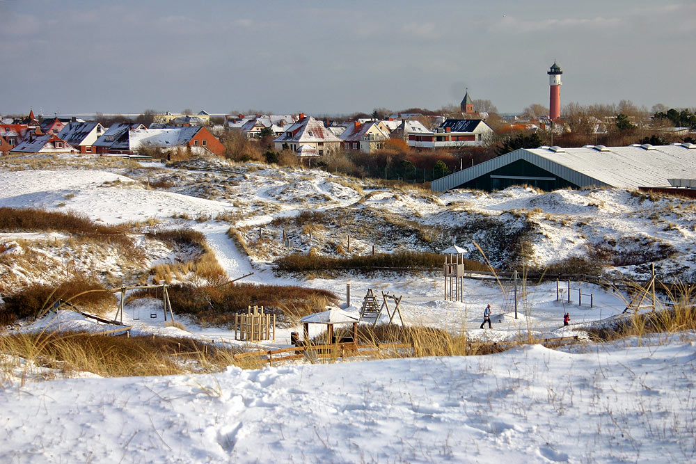 Ein kurzer Blick hinüber zum Abenteuerspielplatz, der wie der Rest der Insel unter einer – für Inselverhältnisse – recht beachtlichen Schneedecke liegt.