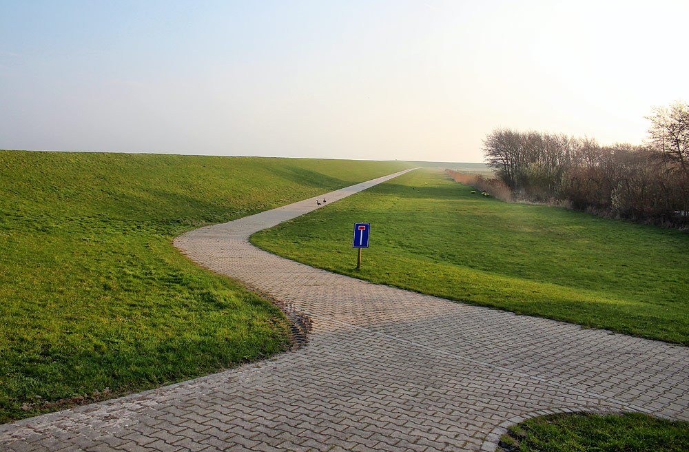 Während der Deichbauarbeiten war diese Strecke zeitweise nur bis zum Pumpenhäuschen befahrbar, daher steht am Deichverteidigungsweg bei Neudeich ein Sackgassen-Schild.