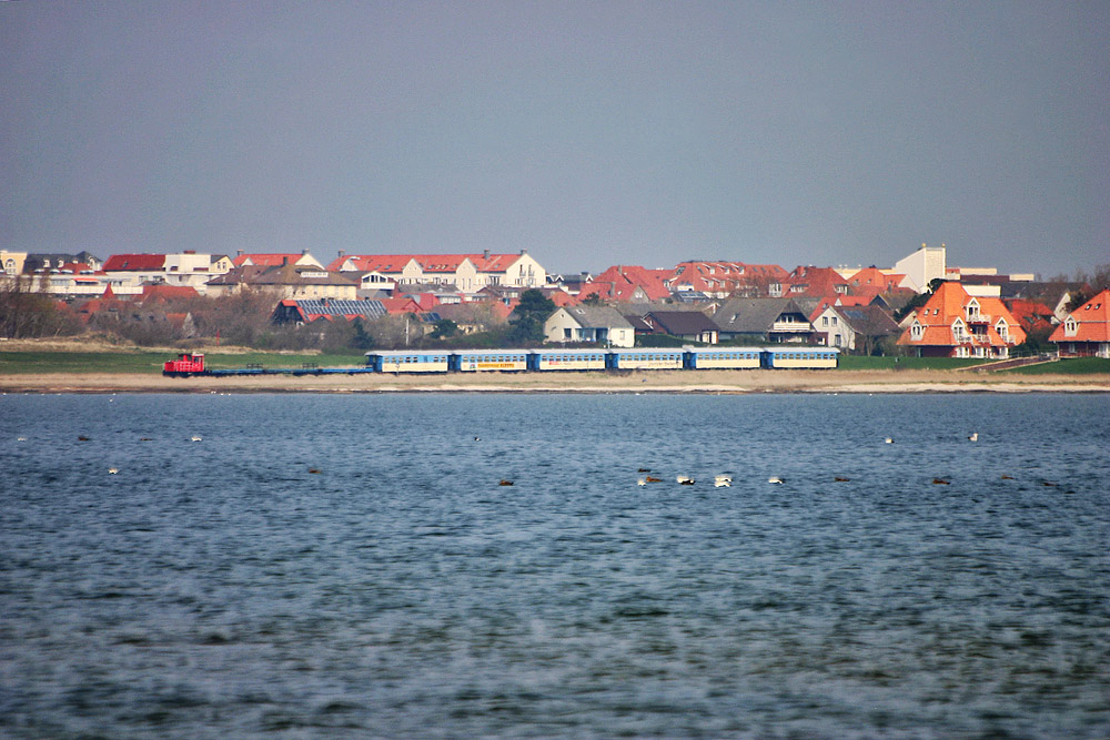 Gemächlich zuckelt die Inselbahn, nachdem sie das Deichschart passiert hat, durchs Deichvorland. Im Hintergrund erkennt man das Inseldorf, von der Straße Am Wattenmeer bis hin zu den großen Bauten an der Promenade wie dem Kaiserhof in der Bildmitte. Auch der Turm der katholischen St. Willehad-Kirche ist rechts zu sehen.