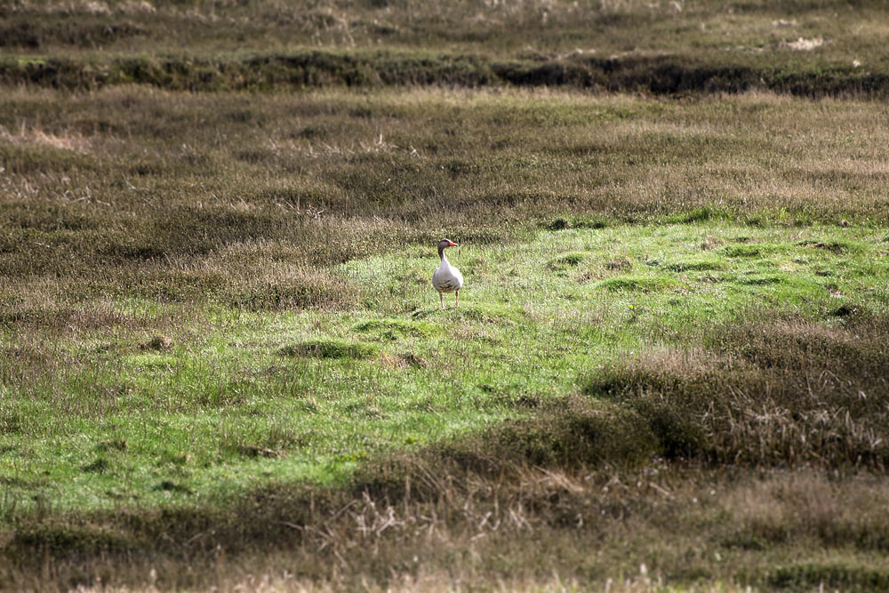 Eine einzelne Graugans auf einer Freifläche im westlichen Teil der Insel.