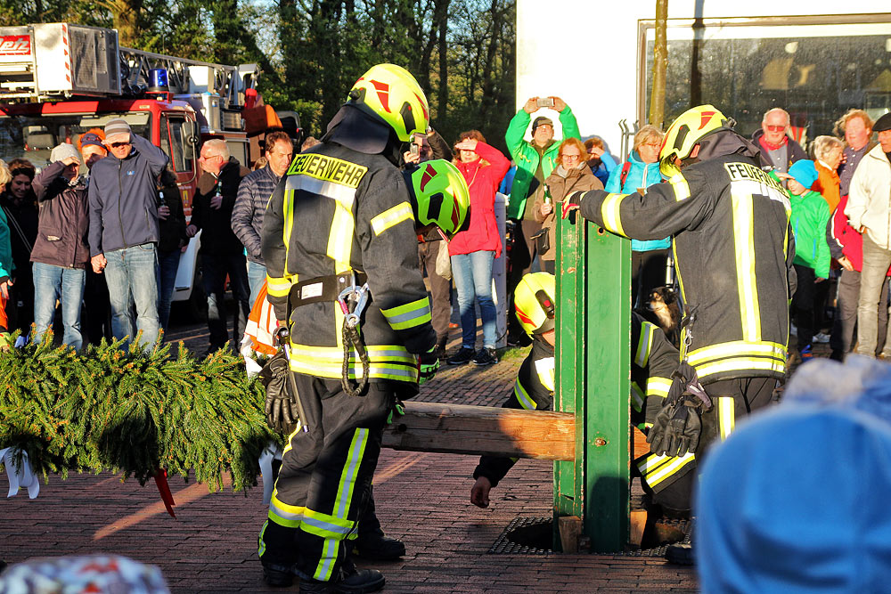 Nun muss der erste Bolzen nur noch verschraubt werden, dann ist der erste Schritt zur Aufstellung des Maibaums getan.