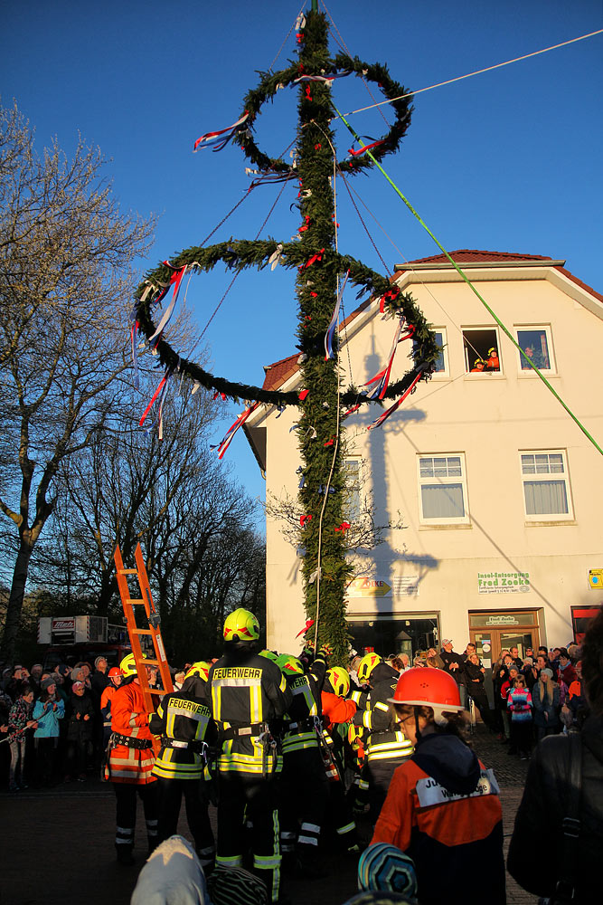 ‹ Es ist vollbracht, der 2018er Maibaum steht! Nun noch vernünftig befestigen und dann kann die Volkstanzgruppe auf den Plan treten.