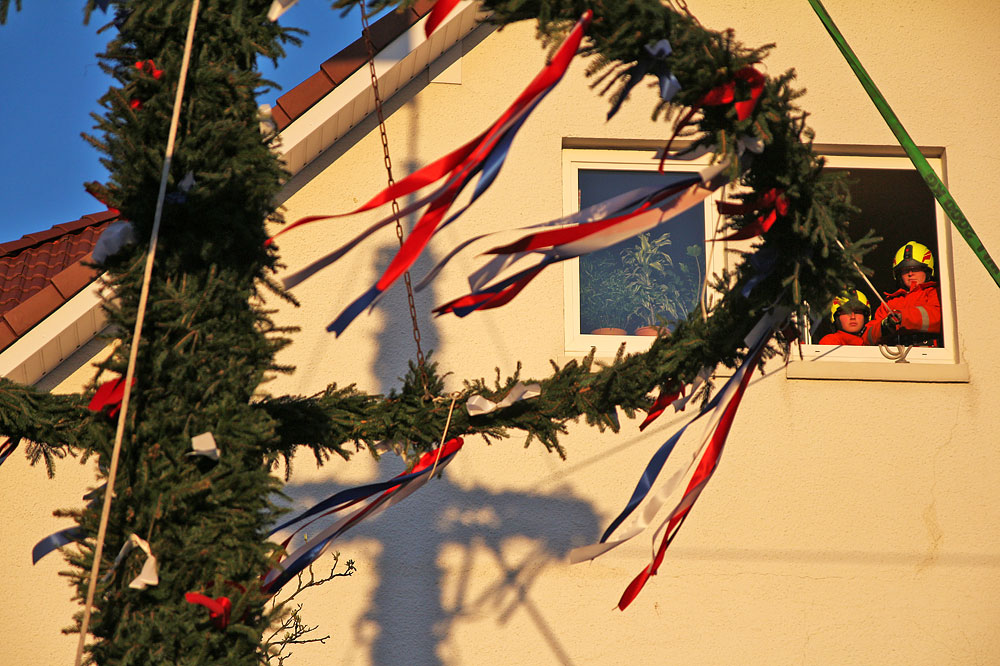 Solange der Maibaum nicht komplett fixiert ist, wird er von den Seiten noch per Seil gesichert.