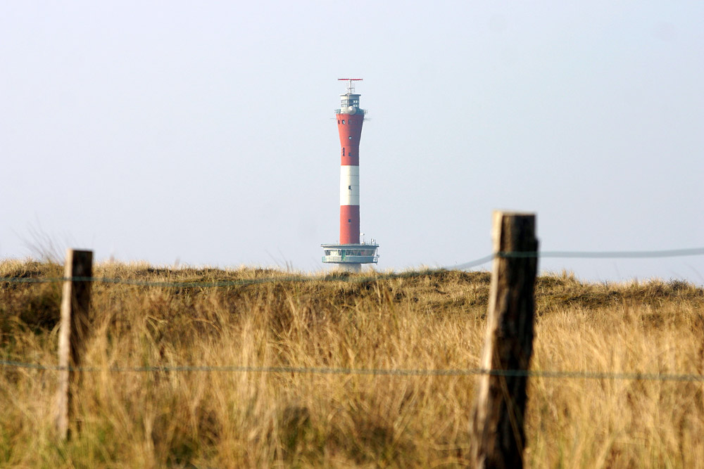 Ein Blick hinüber zum Neuen Leuchtturm, dessen unteres Drittel hier hinter einer alten Dünenkette versteckt liegt.