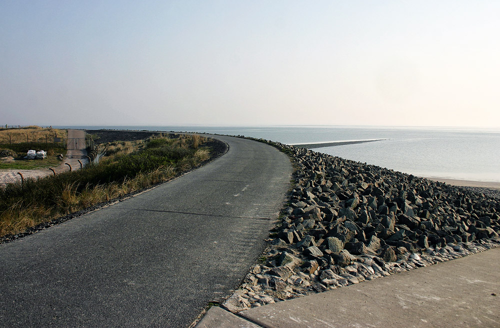 Unterwegs auf dem Westdeckwerk, das an dieser Stelle mit unzähligen Wasserbausteinen statt mit einzelnen Wellenbrechern wie in anderen Abschnitten besetzt ist.