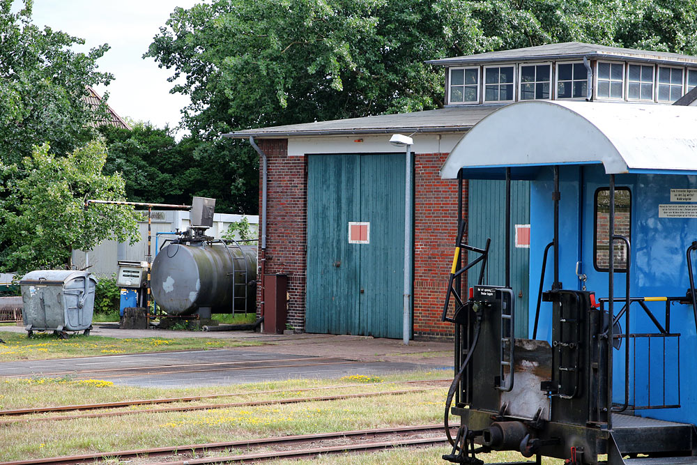 Blick hinüber zum denkmalgeschützten Lokschuppen, der sich direkt südlich des Bahnsteigs befindet.
