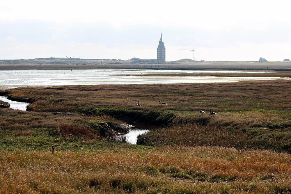 Ein Priel durchzieht den Süderheller, an dessen Rand sich einige Graugänse aufhalten. Im Hintergrund der Westturm und die Harle Hörn-Dünen.
