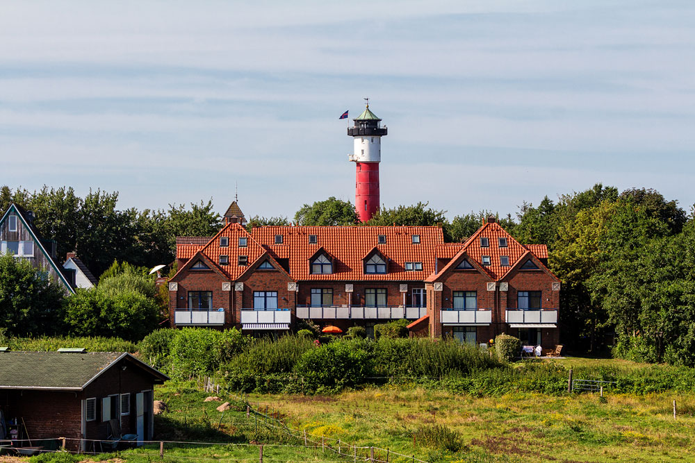 Ein Blick vom Dorfgrodendeich auf den Dorfgroden, hinten der Alte Leuchtturm und links daneben der Bahnhof, der sich allerdings etwas »versteckt«.