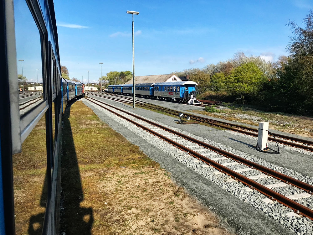 Soeben fahren wir mit dem Zug in den Bahnhof ein. Man hat hier einen sehr guten Blick auf die erst kürzlich runderneuerten Gleise mit Betonschwellen. Rechts steht außerdem ein Zugstamm der Inselbahn auf dem Abstellgleis, da dieser aufgrund der Corona-bedingten Sperrung der Insel zum Zeitpunkt der Aufnahme nicht benötigt wurde.