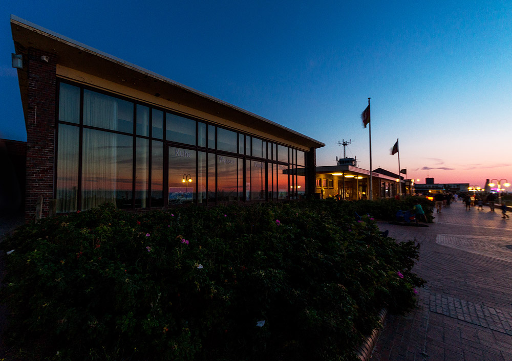 Das Abendrot spiegelt sich in den großen Fensterscheiben des Kleinen Kursaals, während langsam immer stärker die Dämmerung über die Insel hereinbricht.