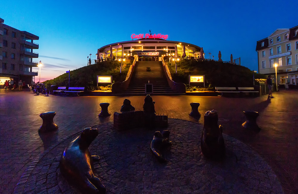 Blaue Stunde im Inseldorf. Geradeaus das Café Pudding, flankiert vom Monopol (links) und vom Strandhotel Gerken (rechts).