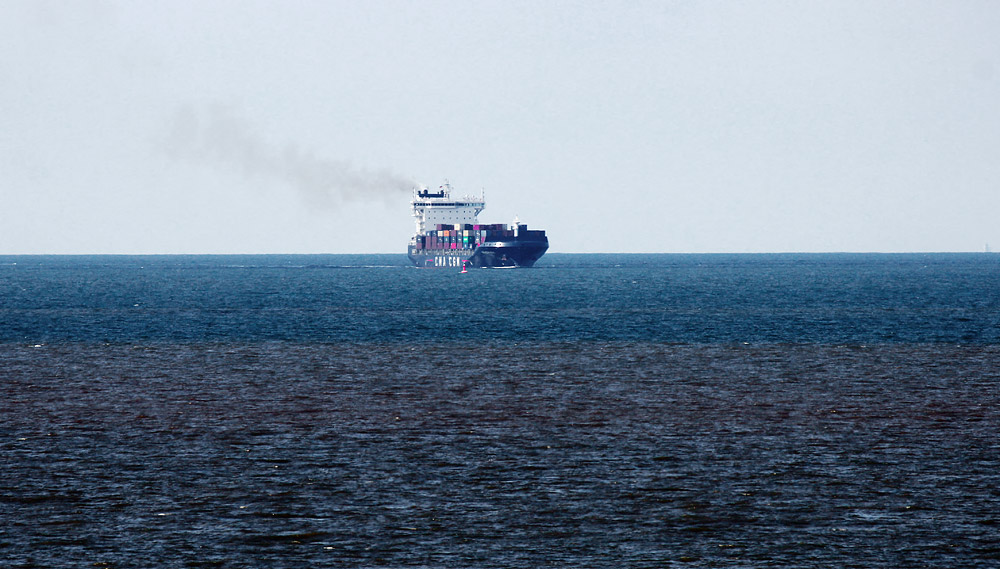 Ein Feederschiff der französischen Reederei CMA CGM im Fahrwasser nördlich der Insel. Mit solchen relativ kleinen Containerschiffen werden Container zwischen den Seehäfen verteilt, da es oft weder möglich noch wirtschaftlich wäre, mit den großen Überseeschiffen die kleineren Häfen anzulaufen.