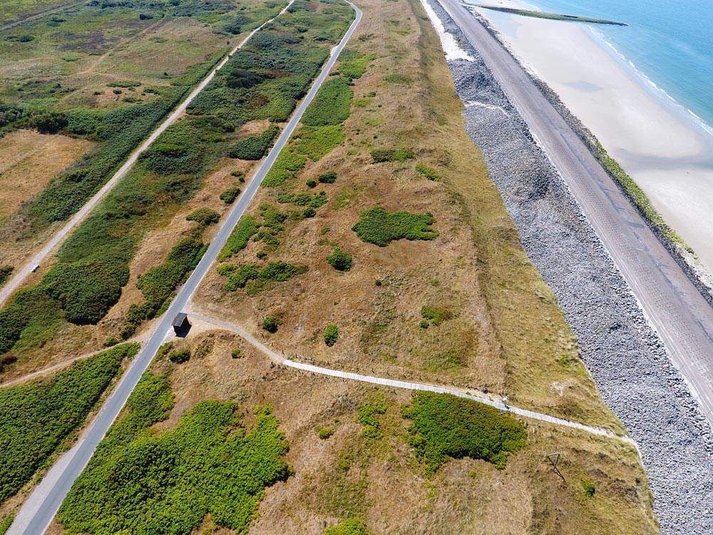 Blick von oben herab auf eine zur Aufnahme leider gesperrte Dünenüberwegung in den Nordwestdünen. Der Grund für die Sperrung ist rechts ersichtlichg, denn entlang des gesamten Nordwest-Längswerks lagern tausende Tonnen Wasserbausteine.