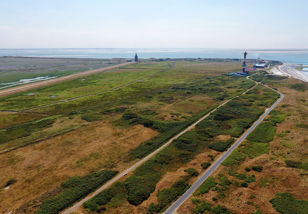 Ausgedehnte Weideflächen befinden sich im Westinnengroden, der sich im Bereich zwischen dem Westturm und dem Neuen Leuchtturm befindet. Unten sehen wir noch einmal die Straße zum Westen (rechts) und nur wenige Meter davon entfernt den Reichsdeich, auf dem der Fußweg zum Westen verläuft.