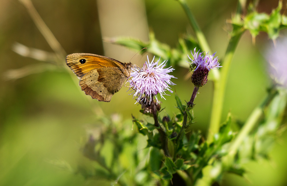 Disteln werden nicht nur gern von Distelfaltern aufgesucht, auch das Große Ochsenauge trifft man dort von Zeit zu Zeit auf Nektarsuche an.