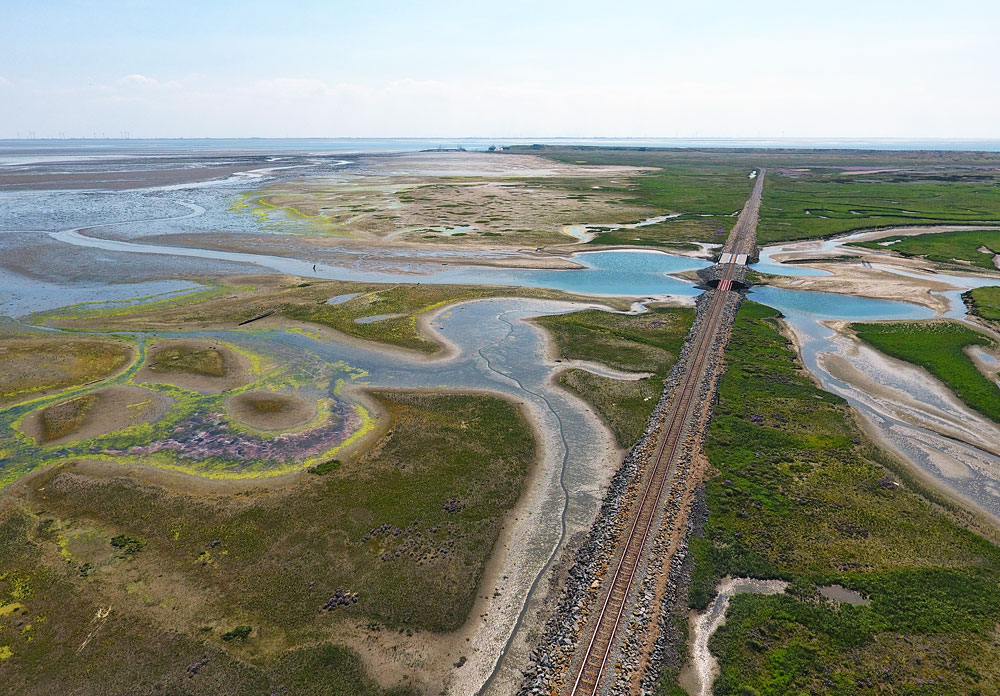 Im Westaußengroden durchschneiden die Gleise der Inselbahn die Salzwiesen, die Priele haben sich entsprechend geformt. Dort, wo die Prielbrücken einen Durchlaß für den Tidestrom schaffen, haben sich Auskolkungen gebildet, die sogenannten Aalkuhlen.