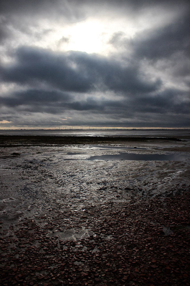 ‹ Wir befinden uns nun am Rande des Wattenmeers, über dem dicke, die Sonne verdunkelnde Wolken hängen.