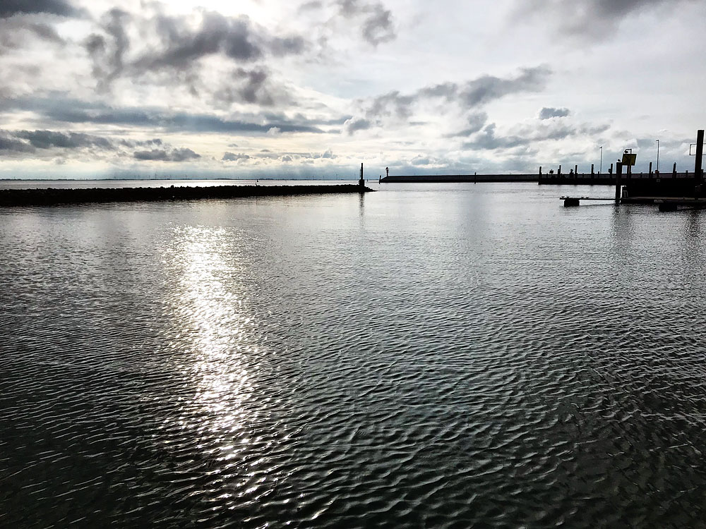 Vom Ende des Gästestegs zur Hafeneinfahrt des Westanlegers geblickt.