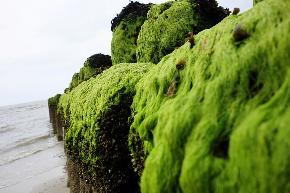 Algen scheinen sich auf den Oberseiten der Pfähle dieser Pfahlbuhne wohl zu fühlen.
