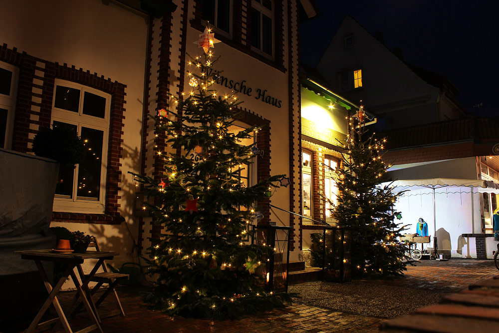 Zwei Weihnachtsbäume schmücken den Eingang vom Wünsche Haus.