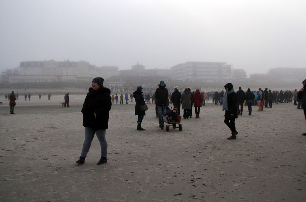Zahlreiche Schaulustige haben sich am Strand eingefunden, um dem Spektakel des Jahres-Abbadens beizuwohnen.