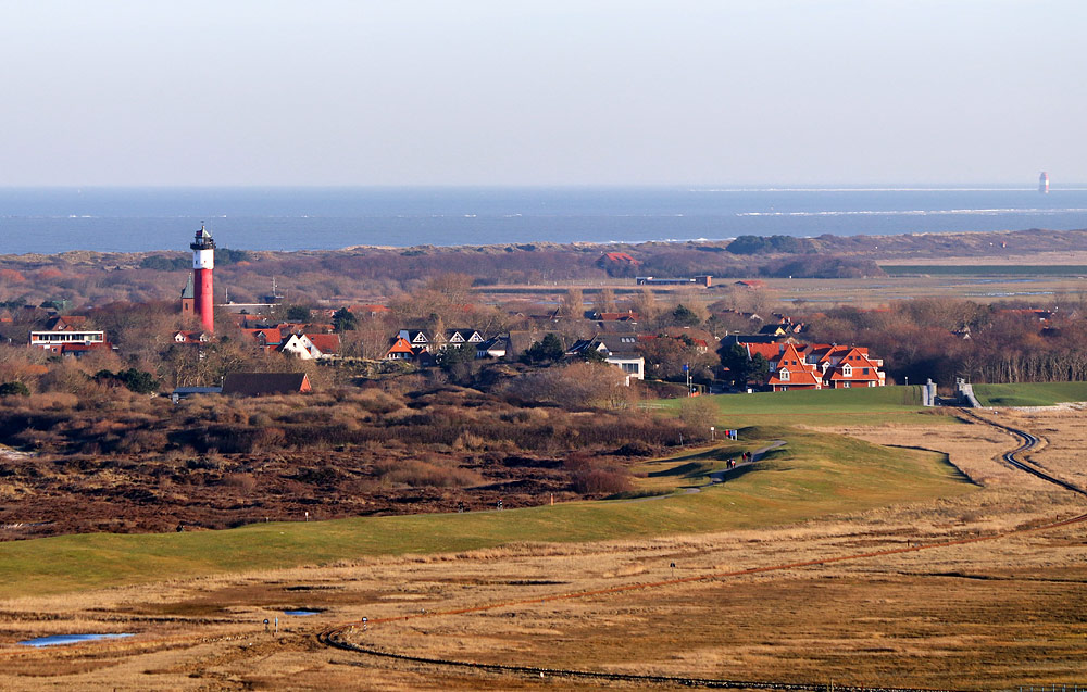 Ein weiteres Foto, das vom Neuen Leuchtturm aus aufgenommen wurde: Vorn verläuft die Strecke der Inselbahn durchs vor dem Süddeich gelegene Deichvorland. Dahinter das Inseldorf mit Altem Leuchtturm und Nikolaikirche und rechts der Straße Am Wattenmeer. Ferner erkennt man etwas weiter hinten die Kläranlage im Ostinnengroden und ganz rechts im Dunst den Leuchtturm Mellumplate.