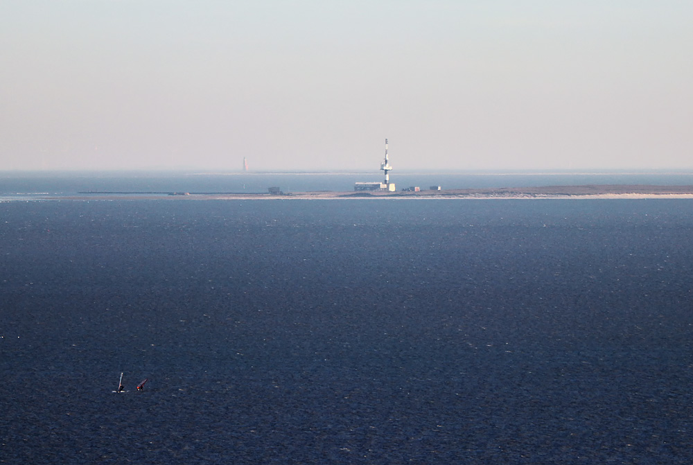 Respekt: Zwei Surfer sind bei der Kälte im Watt südlich von Wangerooge unterwegs. Weiter hinten erkennt man die östliche Nachbarinsel Minsener Oog mit Radarturm Minsener Oog Buhne C, ganz im Hintergrund außerdem den Leuchtturm Hohe Weg in der Außenweser und dazwischen die Vogelinsel Mellum.