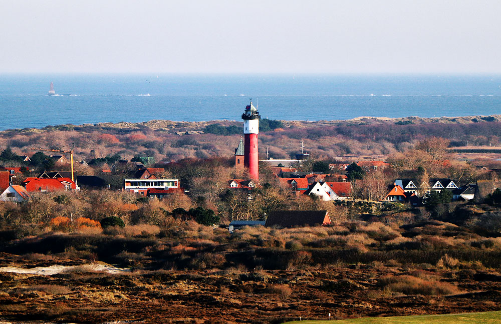 Blick von Leuchtturm zu Leuchtturm, nur daß der hier sichtbare Turm bereits 1856 und damit über 100 Jahre zuvor erbaut wurde. Zur Bauzeit befand er sich noch am Ostende der Insel, im Laufe der Jahrzehnte ist die Insel dann mehrere Kilometer in Richtung Osten gewachsen.