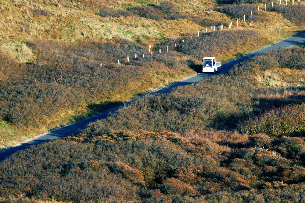 Der weiße E-Karren, der auf der Straße zum Westen angefahren kommt, wirkt ein wenig wie ein Spielzeugauto auf einer Modelleisenbahn.