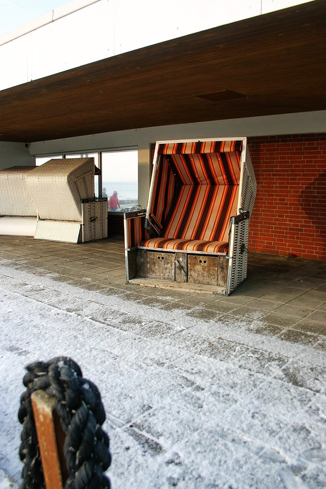 ‹ Wettergeschützt standen, als es den Wandelgang noch gab, auch im Winter einige Strandkörbe auf der Liegeterrasse am Cobigolf-Platz.