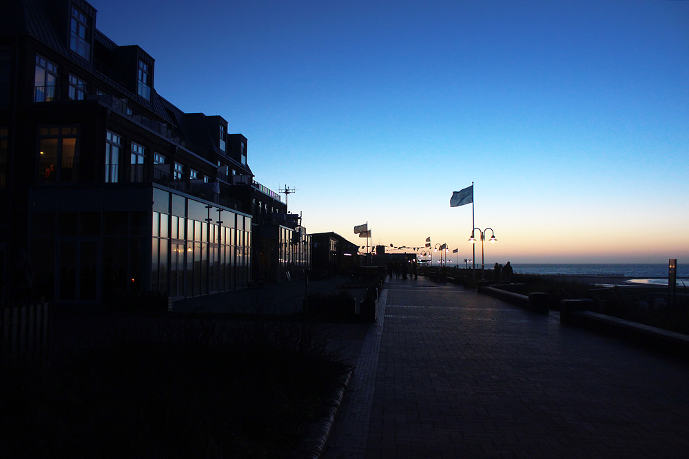 Abenddämmerung an der Strandpromenade. Links das Aparthotel Anna Düne.