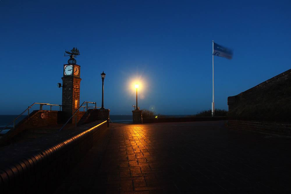 Ein toller blau-gelber Farbkontrast tritt in der Abenddämmerung hervor. Wir stehen gerade neben dem Pudding und blicken zur Uhr, die an einer Treppenanlage steht.