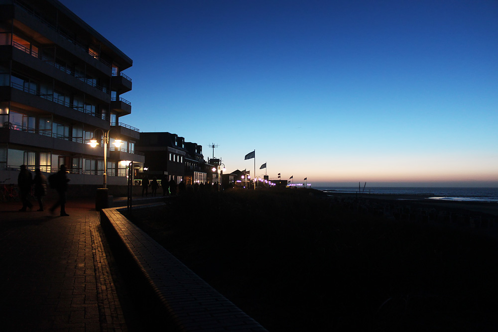 Strandpromenade mit Haus Monopol und Aparthotel Anna Düne zur Blauen Stunde. Bei der Blauen Stunde handelt es sich um den Zeitraum nach Sonnenuntergang, in dem der Himmel noch recht hell ist und sich Objekte davor dunkel bzw. schwarz abzeichnen.