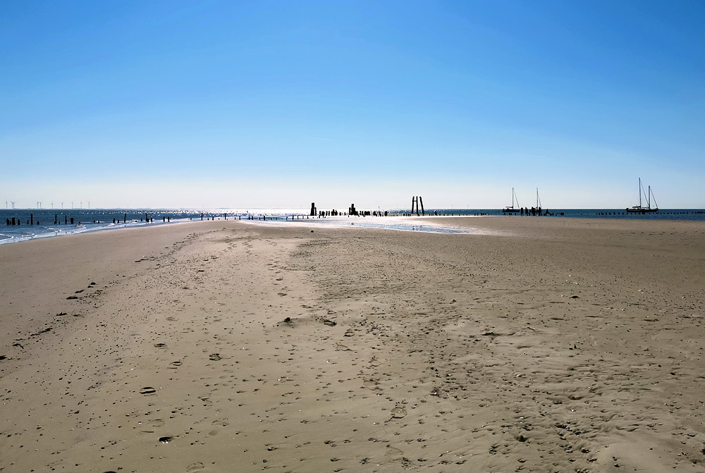 Ein Strandspaziergang um die Wangerooger Ostspitze führt am ehemaligen Ostanleger vorbei, dessen Pfahlreste geradeaus zu erkennen sind.