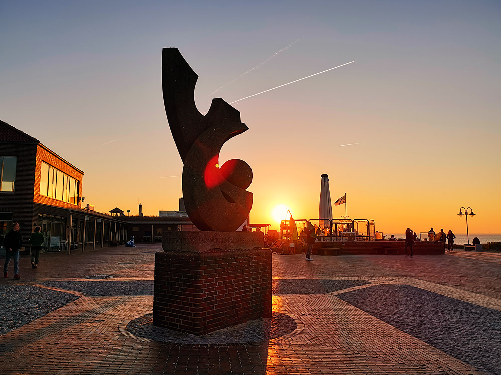 Platz am Meer zur Abendzeit. Im Hintergrund die Schirmbar Digger's Außenposten, die an diesem Abend ohne Schirm auskommt.