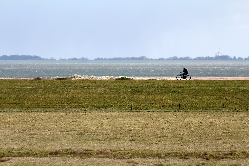 Blick hinüber zum Westgrodendeich, auf dem gerade ein Fahrradfahrer geschwind vom Westturm aus in Richtung Dorf radelt.