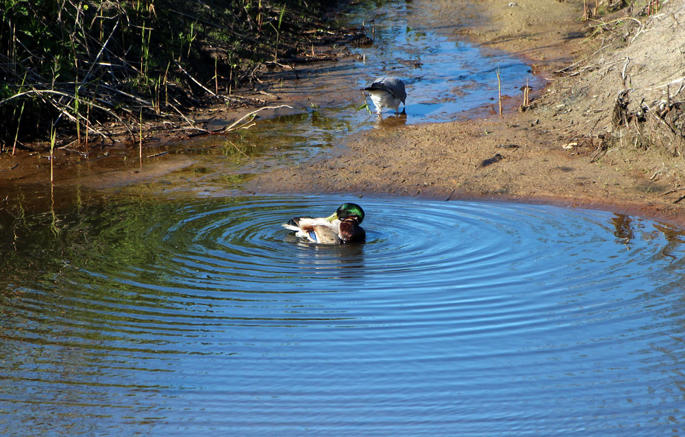 Diese Stockente widmet sich gerade intensiv der Körperpflege, indem sie sich in einem Wasserloch ausgiebig putzt.