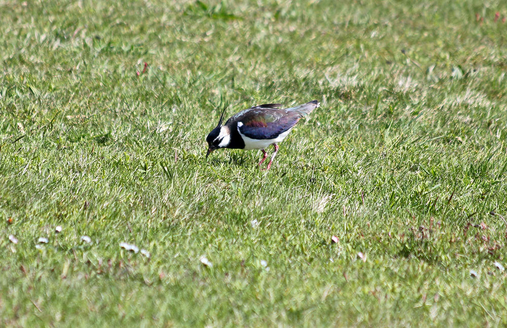 Hier sehen wir einen Kiebitz, der am Deich auf Nahrungssuche ist. Er frißt gern Insekten und Larven, aber auch Regenwürmer oder Samen.