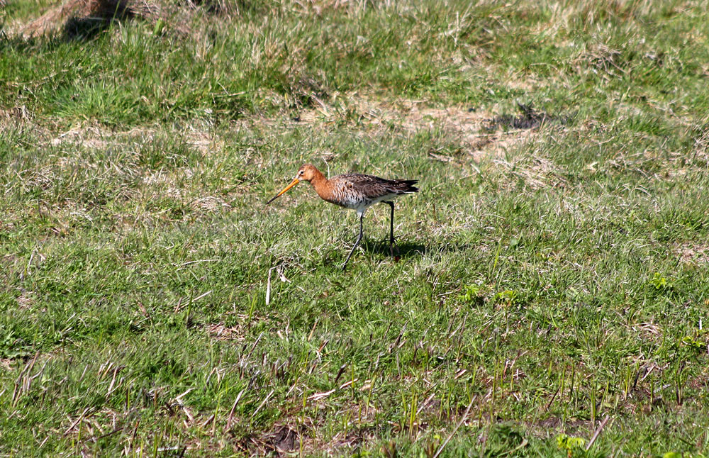 Mit ihren langen Beinen stolziert eine Uferschnepfe durch die Weiden des Westinnengrodens.