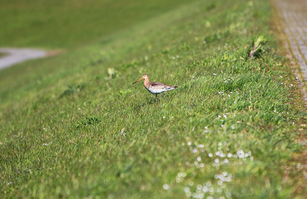 Besonders gern sind Uferschnepfen auf den Weiden des West- und Ostinnengrodens unterwegs, aber auch am Deich kann man sie häufiger bei der Nahrungssuche beobachten. Hier sieht man ein Exemplar, wie es gerade den Ostgrodendeich hinab läuft.