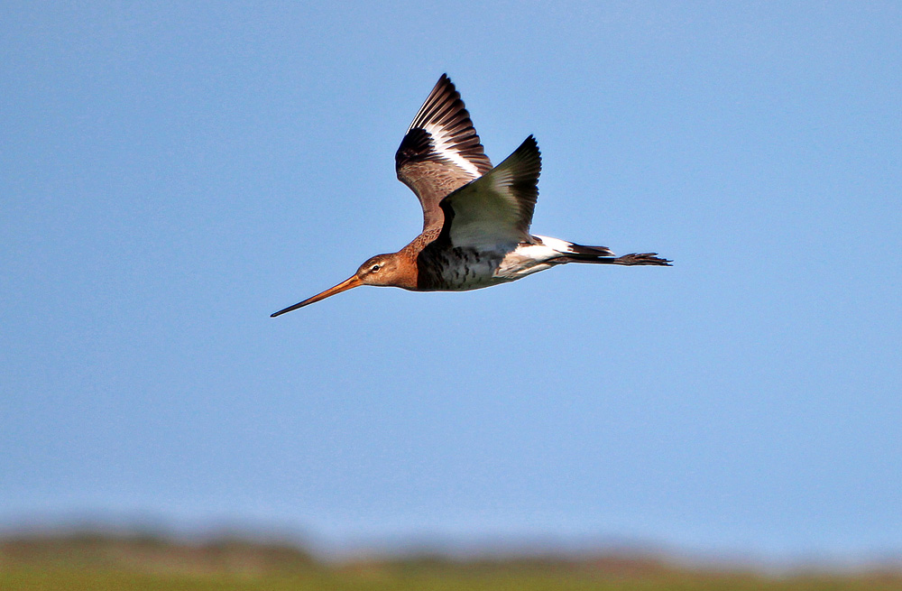 Elegant zieht die Uferschnepfe, ein großer Watvogel mit langem Schnabel, vorüber.