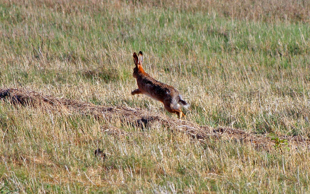 Geschwind rennt ein Inselhase durchs Salzwiesen-Gras.